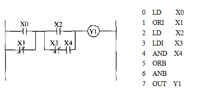 正确答案:参考一:|0 LD X0|1 ANI X1|2 LD X2|3 AND X3|4 ORB|5 LDI X4|6 AND X5|7 ORB |8 OUT Y5|参考二:|0 LD X0|1 ANI X1|2 LD X2|3 AND X3|4 LDI X4|5 AND X5|6 ORB|7 ORB|8 OUT Y5