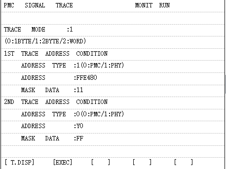 (1)“TRACE MODE”、 “ADDRESS TYPE”、“ MASK DATA”的中文意思是什么? (2)软键“[EXEC]”的功能是什么?