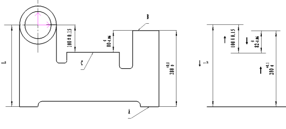 24、(单选题)零件如图所示,镗削零件上的孔。孔的设计基准是C面,设计尺寸为(100±0.15)mm。为装夹方便,以A面定位,按工序尺寸L调整机床。工序尺寸280mm、80mm在前道工序中已经得到,在本工序的尺寸链中为组成环。而本工序间接得到的设计尺寸(100±0.15)为尺寸链的封闭环,尺寸80mm和L为增环,280mm为减环,那么工序尺寸L及其公差应该为()。|