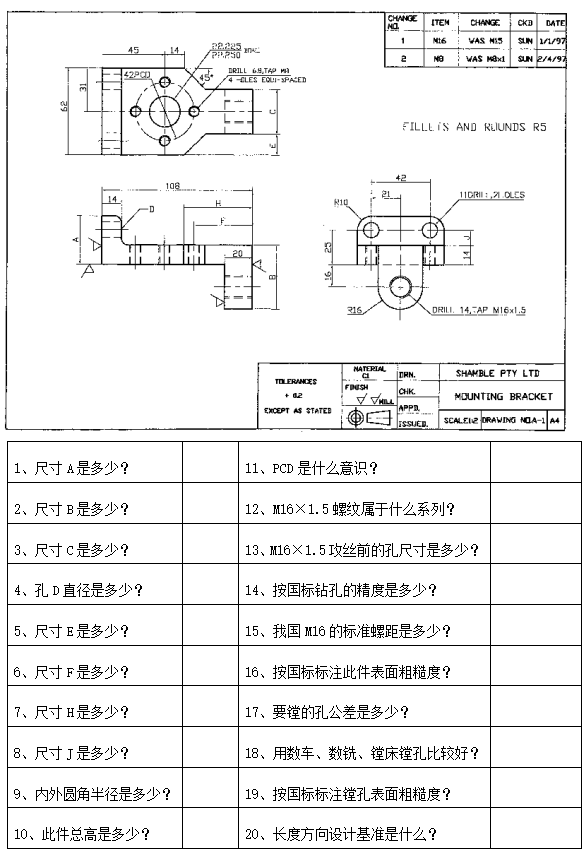 正确答案:1、尺寸A是多少? 35mm|2、尺寸B是多少? 46mm|3、尺寸C是多少? 32mm|4、孔D直径是多少? 11mm|5、尺寸E是多少? 15mm|6、尺寸F是多少? 42mm|7、尺寸H是多少? 49mm|8、尺寸J是多少? 11mm|9、内外圆角半径是多少? R5mm|10、此件总高是多少? 67mm|11、PCD是什么意识? 同心圆均布|12、M16×1.5螺纹属于什么系列? 细牙系列|13、M16×1.5攻丝前的孔尺寸是? φ14mm|14、按国标钻孔的精度是多少? IT13左右|15、我国M16的标准螺距是多少? 2mm|16、按国标标注此件表面粗糙度? Ra3.2~Ra1.6|17、要镗的孔公差是多少? 0.025|18、镗孔用数车、数铣、镗床比较好? 数控铣床|19、按国标标注镗孔表面粗糙度? Ra0.8~Ra0.4|20、长度方向设计基准是什么? B×C的平面