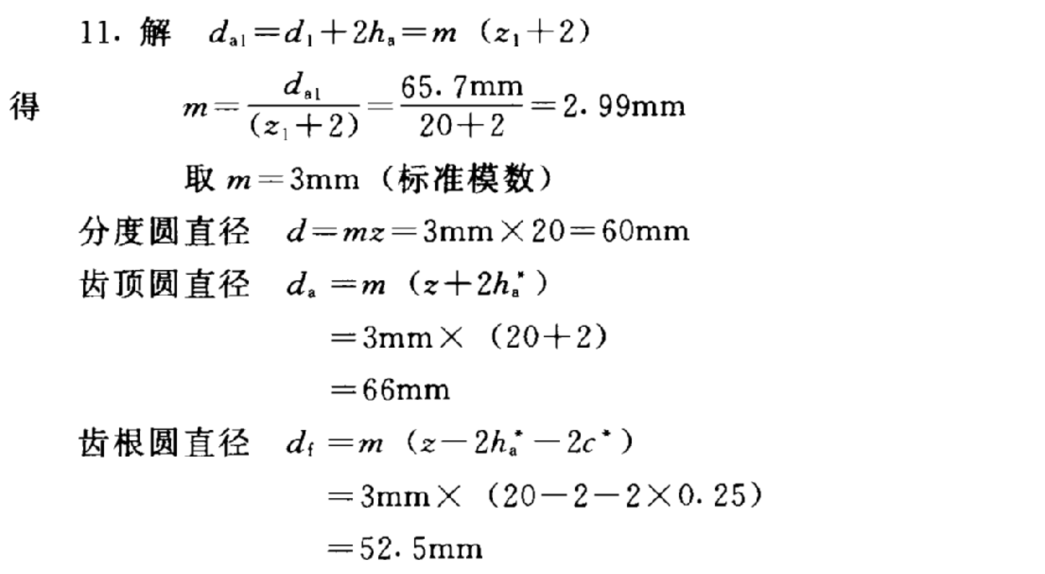 16、(主观题)修配一个已损坏的齿数为20的标准直齿圆柱齿轮。实测得齿顶圆直径约为65.7mm,试确定该齿轮的主要尺寸。