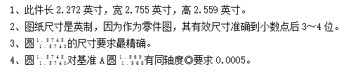 18、(主观题)识图题:阅读下图,回答下列问题:(1)此件长、宽、高的最大尺寸是多少?(2)此图尺寸是公制还是英制?根据何在?(3)哪一个尺寸要求最精确?(4)哪一部分有位置公差要求?(5)此图属第几角投影?根据何在?