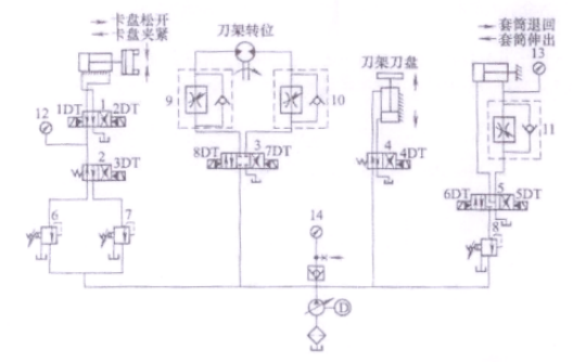 11、(主观题)图示为MJ-50数控车床液压系统的原理图,简述卡盘分系统的工作原理。|